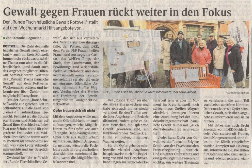 Am Samstag, den 29.11.2025 präsentierte sich der Rottweiler Runde Tisch „häusliche Gewalt“ erstmals in der Öffentlichkeit auf dem Wochenmarkt. Im Rahmen der bundesweiten Aktionswoche gegen Gewalt an Frauen machten der Verein zur Förderung der Bewährungshilfe, Frauen-helfen-Frauen und Auswege e.V. (FhF) sowie das DRK als Vertreter des Runden Tisches auf dieses sensible, aber sehr wichtige Thema aufmerksam und zeigten auch Hilfsmöglichkeiten und -angebote auf. Als besonderer Hingucker wurden auch „Rote Schuhe“ platziert und die Rote Bank von FhF aufgestellt („Kein Platz für Gewalt“), um Aufmerksamkeit zu erregen und mit interessierten Bürgern ins Gespräch zu kommen. Die Roten Schuhe werden im Zusammenhang mit häuslicher Gewalt stellvertretend für von Gewalt betroffene Kinder und Frauen eingesetzt. Besonders erfreulich war, dass die Presse auf die Aktion aufmerksam geworden ist. So wurde die Arbeit des Runden Tisches durch den Presseartikel von  Stefanie Siegmeier nochmals beleuchtet und vorgestellt. Der Bewährungshilfeverein wurde von Steffen Wagner und Brigitte Schuh repräsentiert. Frau Schuh konnte so über das Angebot der Psychosozialen Prozess- und Zeugenbegleitung informieren und Steffen Wagner stand als Ansprechpartner für das Arbeitsfeld der Täterarbeit mit gewaltbereiten Männern bereit. Der ausgebildete Anti-Aggressivitäts-Trainer (AAT®) befindet sich derzeit in einer Weiterbildung der Bundesarbeitsgemeinschaft Häusliche Gewalt, um in Zukunft als Fachkraft für Täterarbeit im häuslichen Kontext ansprechbar zu sein und entsprechende Hilfen anbieten zu können.