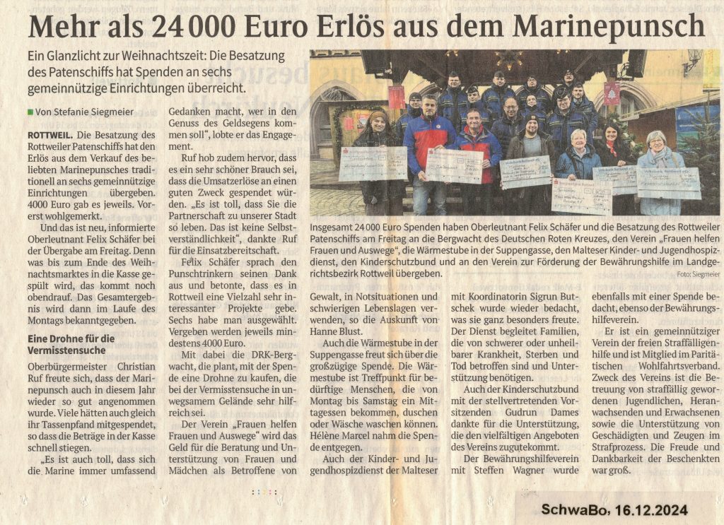 In diesem Jahr freute es besonders, dass neben weiteren sozialen Projekten und Einrichtungen auch der Verein zur Förderung des Bewährungshilfe bei der jährlichen Spendenverteilung aus dem Verkaufserlös des Marinepunschs auf dem Rottweiler Weihnachtsmarkt berücksichtigt wurde. Steffen Wagner nahm als Vertreter des Vereins den symbolischen Spendenscheck bei der feierlichen Übergabe durch die Marine und den Oberbürgermeister Dr. Christian Ruf entgegen. Weitere mit Spenden bedachte Organisationen waren das DRK, der Verein Frauen-helfen-Frauen und Auswege e.V., die Wärmestube, die Bergwacht, der Malteser Kinder- und Jugendhospizdienst sowie der Kinderschutzbund.