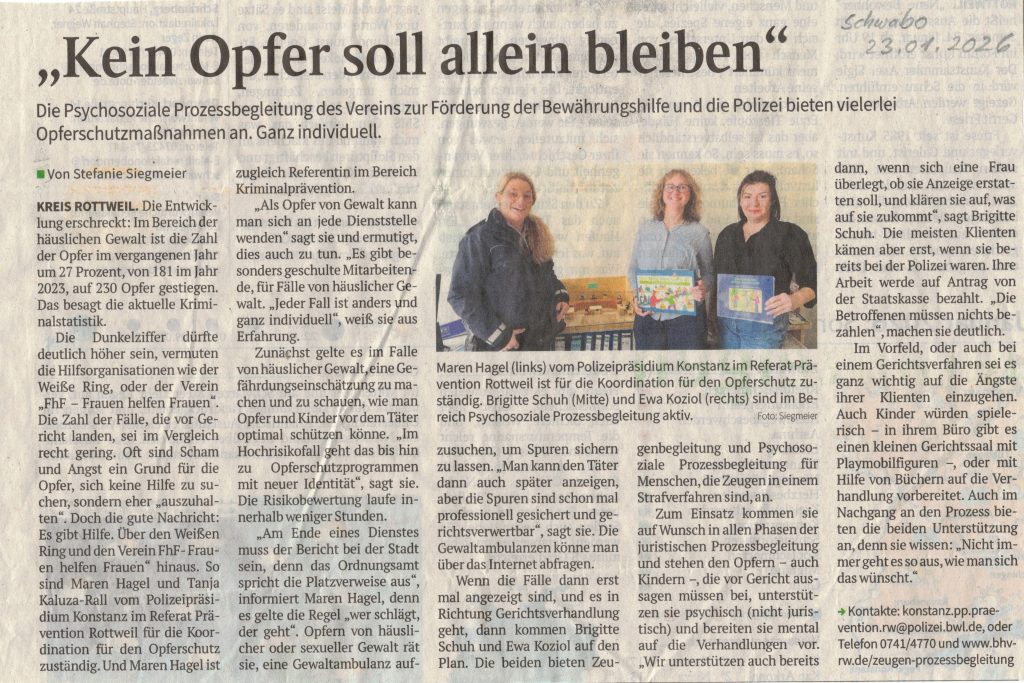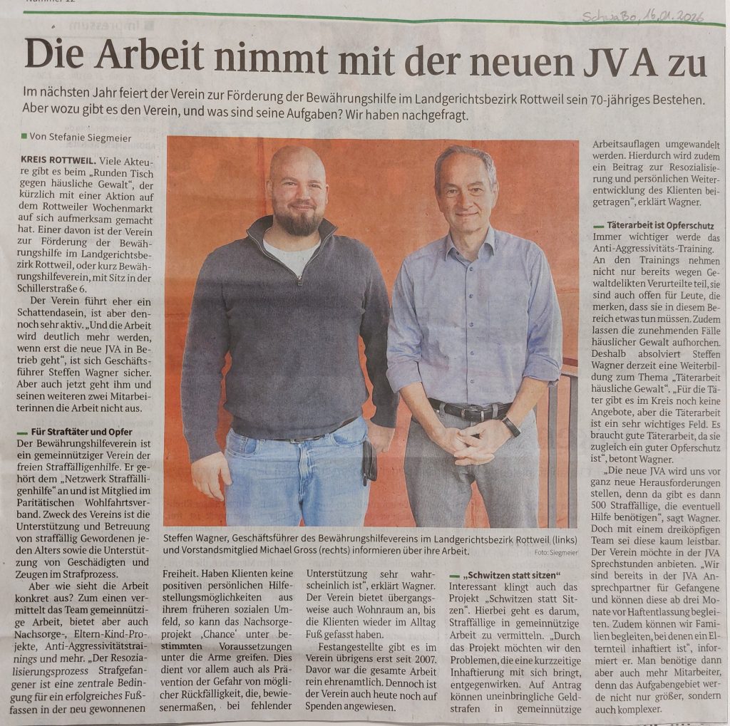 „Die Arbeit nimmt mit der neuen JVA zu“ – Unter diesem Titel ist am 16.01.2026 ein Zeitungsartikel im Schwarzwälder Boten zum Verein und unserer Arbeit erschienen. Mit Fertigstellung der neuen JVA in Rottweil werden die Aufgabenfelder im Verein erweitert werden müssen. Die Vorbereitungen und Vorüberlegungen hierzu laufen schon an.